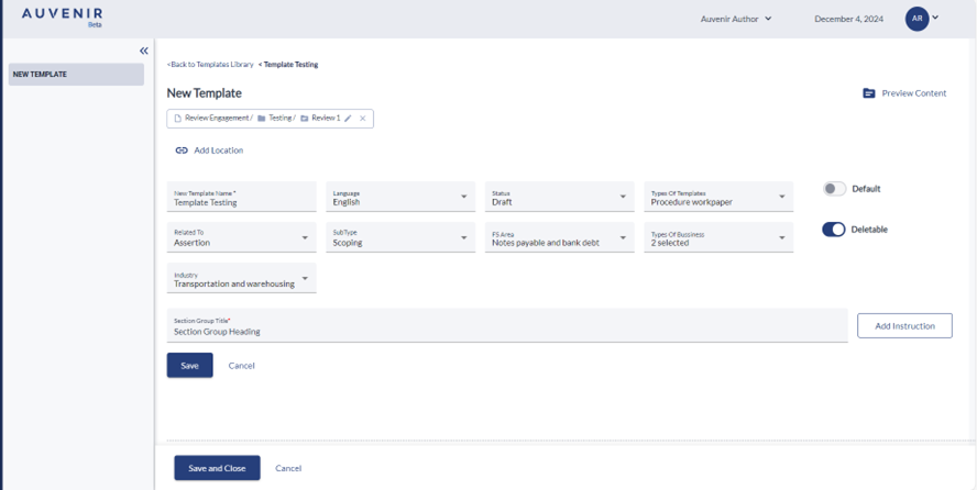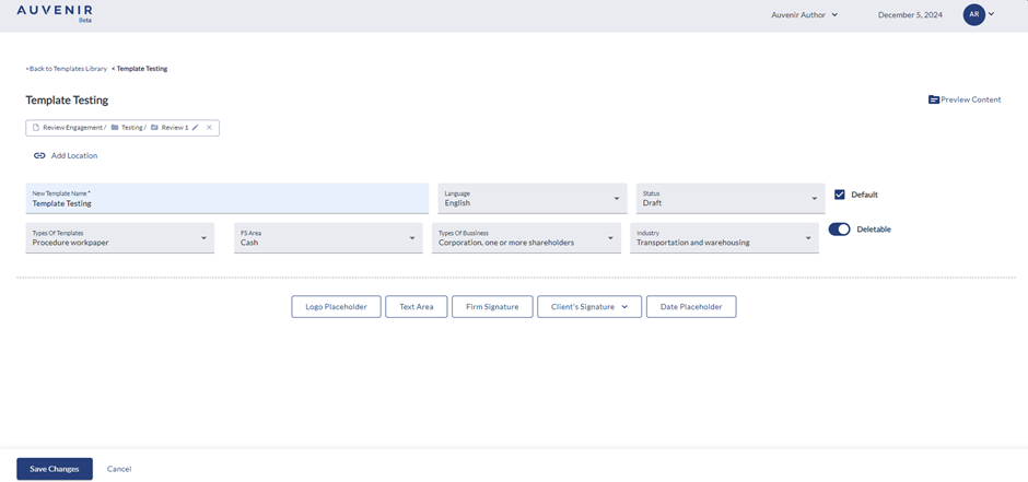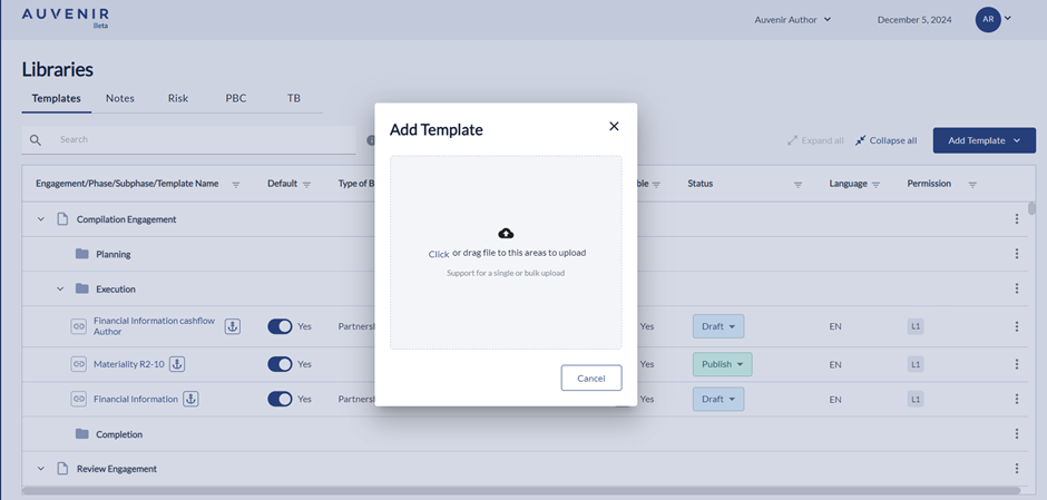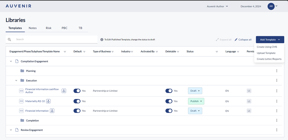 - Below this hyperlink, there should be a "New Template" header and “Add location” option. User can link the new template to any phases like compilation, Review or Audit engagement with the respective sub-phases like Planning, Execution and Completion.