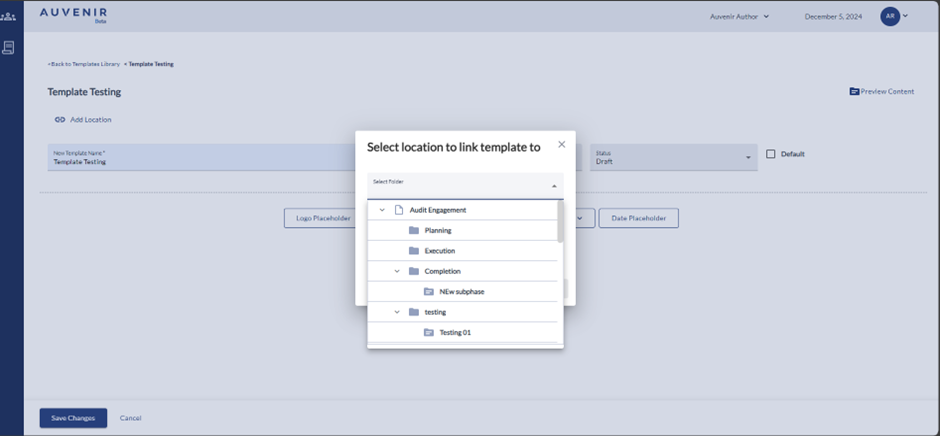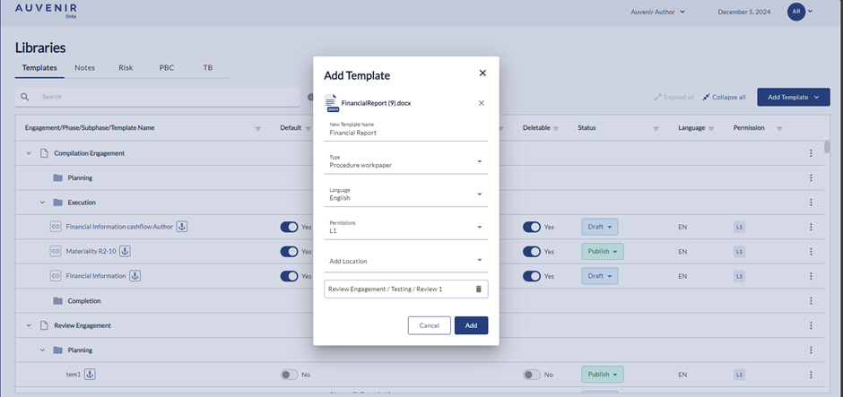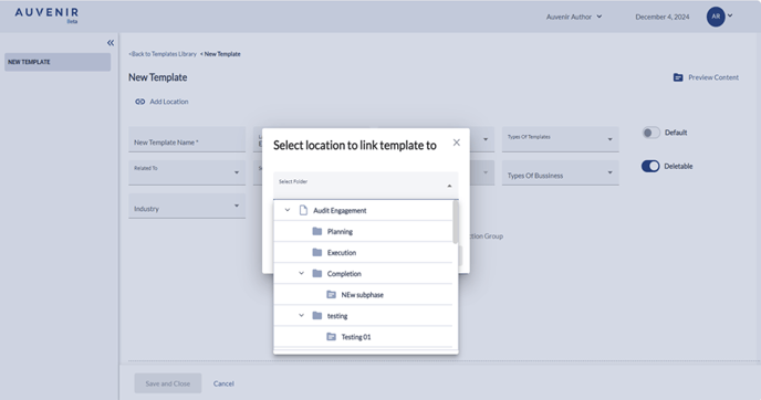 - Below the hyperlink, there should be a "New Template" header and “Add location” User can link the new template to any phases like compilation, Review or Audit engagement with the respective sub-phases like Planning, Execution and Completion.