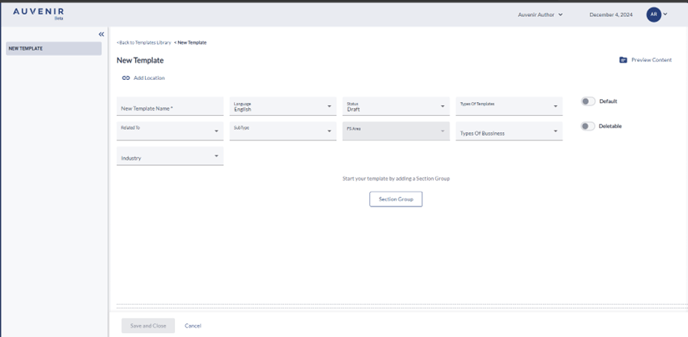 - On clicking "New template name" user can provide the template name, and dropdowns are available for selecting "language" and "status”, “Type of Template”, “Related to” “Subtype” "FS Area” "Type of Business” and "Industry” as per the requirement. There is toggle to activate the template as a default template which will be available as default when it gets published. Deletable toggle helps the user to make the template deletable by default.