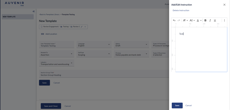 - Click on the "Add Instruction" button to open a dialog box. In the dialog box, user can add the required instructions. On clicking the save button, the provided instruction will visible besides the Section heading. User is able edit the provided instruction by clicking on the edit instruction button.