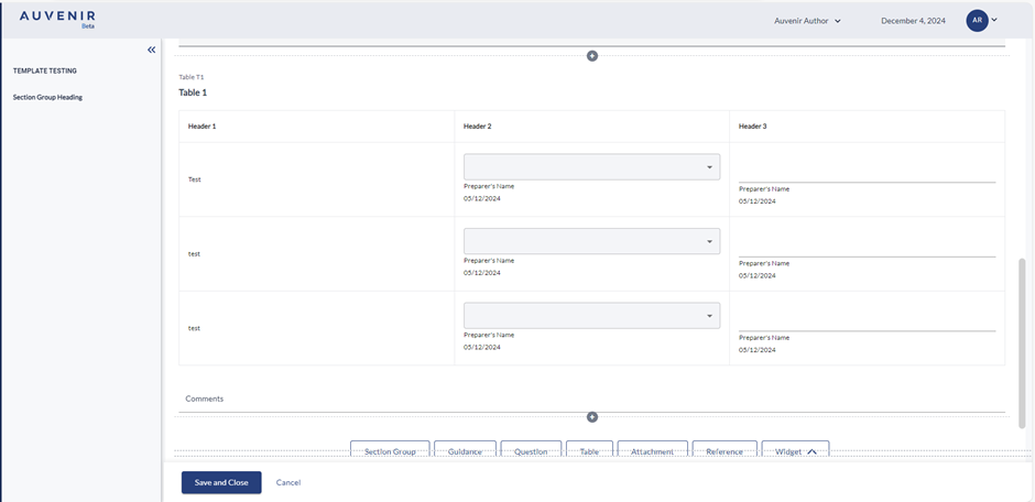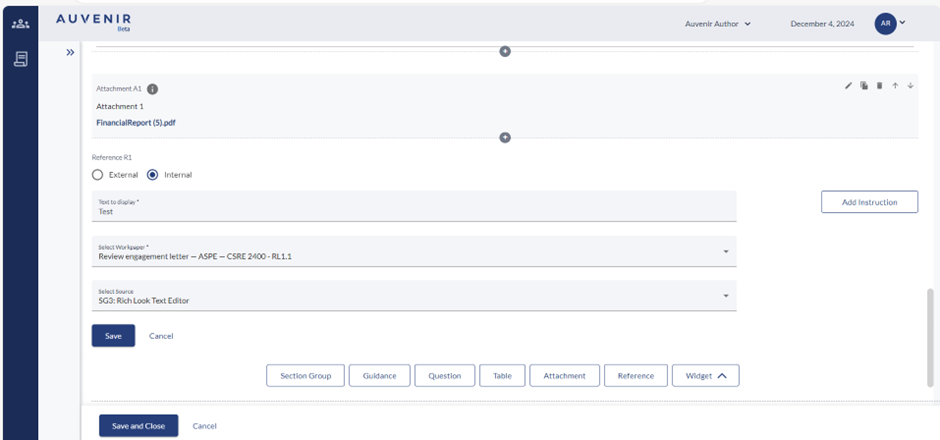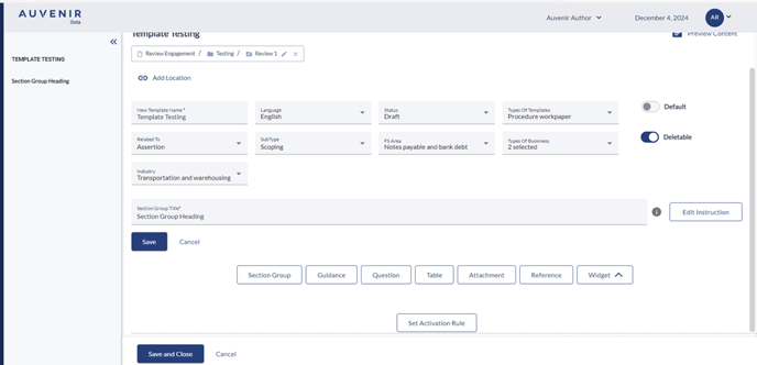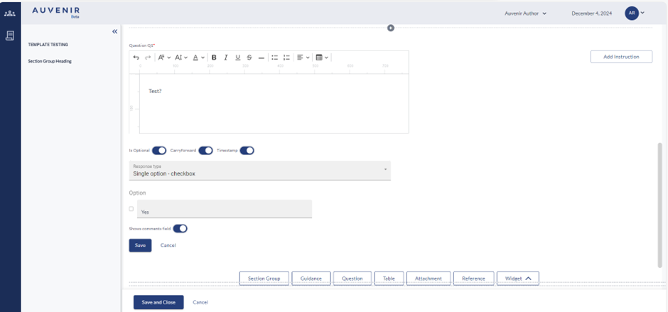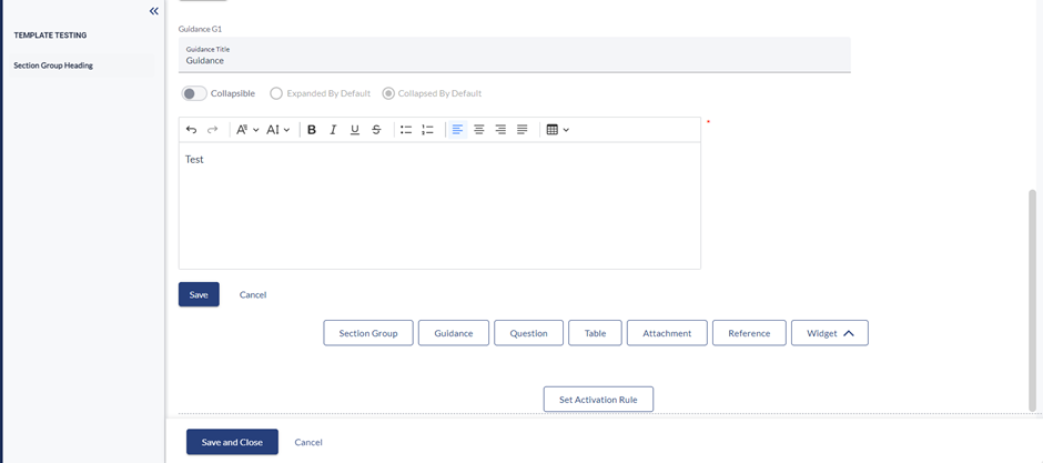 - On clicking on the save button the text and instruction entered will get saved and below the section, following buttons will be available: "Section group," "Guidance," "Question," "Table," "Attachment," "Reference," and "Widgets".