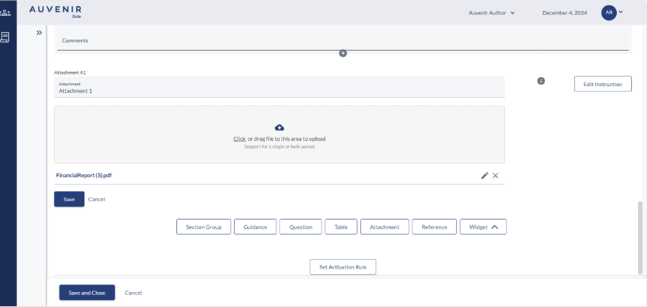 - Users can add attachment heading and instruction button which have the same functionality as it does in the Add section group, guidance, question etc