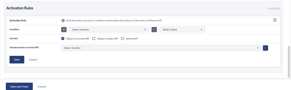 - In Activation Rows - Section in Current WP: Dropdown to select the section to activate. section in Other WP: Two dropdowns to select WP and the section to activate. Whole WP: Dropdown to select an entire WP to activate.