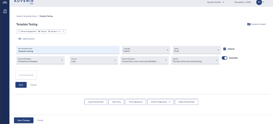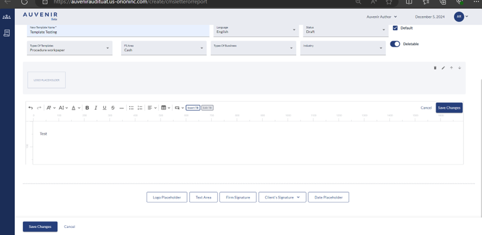 - User can add “Logo Placeholder” which will help the user to display the Firm logo in the respective engagements. Users can use the functionalities like save, cancel, edit, and rearrange as per their requirement.