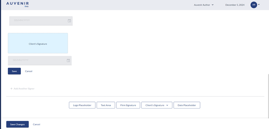- User can add “Firm Signature “in the template which will reflect in template when the User logged in and directed to active engagement screen. Users can use the functionalities like save, cancel, edit, and rearrange as per their requirement. CMS author can only add one firm signature component per document. Signature will be enabled after the document is marked as completed