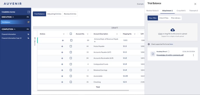Users will have the ability to add a new File/Attachment on the Trial Balance and Workpapers so as to ensure all supporting documents are available for review.