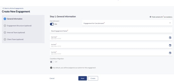 - You select the carryforward option to initiate the creation of a new engagement, thereby carrying forward elements from a previous engagement.