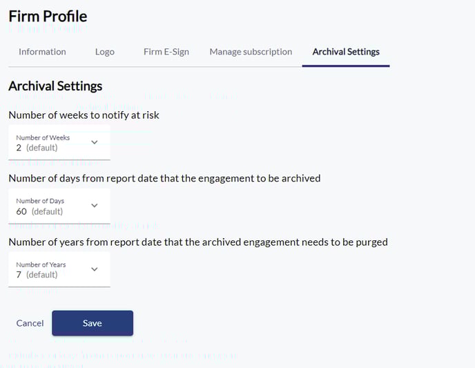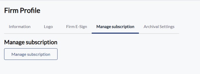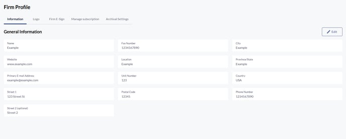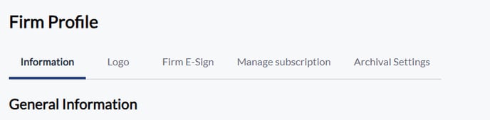 - There will be 5 tabs available on the top of the screen - Information, Logo, Firm E-sign, Manage Subscription, Archival settings