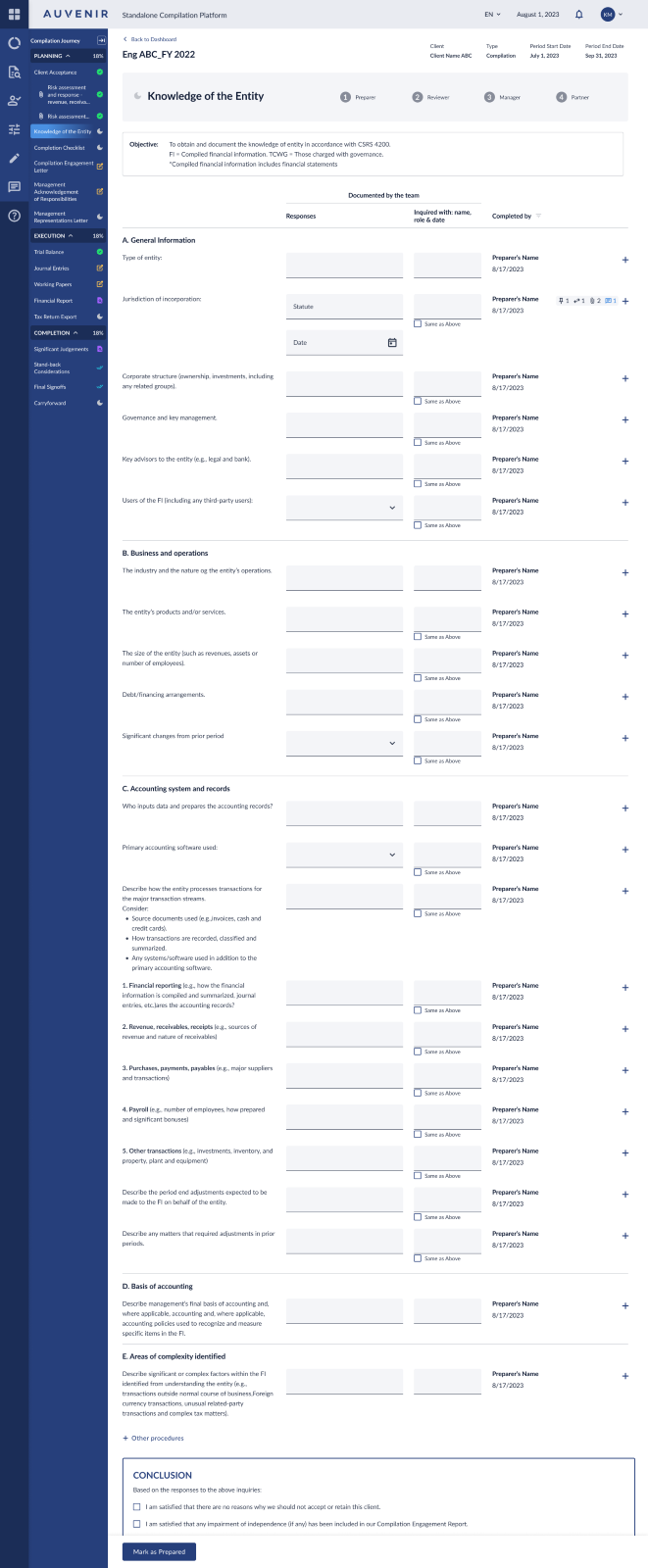 - The Mark as Prepared button will be frozen and be displayed despite of scrolling. Once clicked the Mark as Prepared button will change to Mark as Reviewed. Once clicked the Mark as Reviewed will change to Mark as Manager Reviewed and once Manager reviewed is clicked it will change to Mark as Complete. Once Partner clicks on Mark as complete the label will change to Complete and will no longer be clickable. After being marked as Complete the screen will no longer be editable.