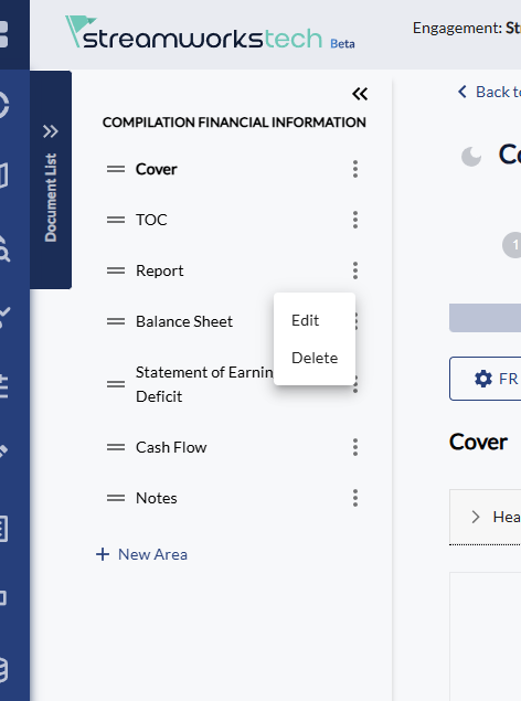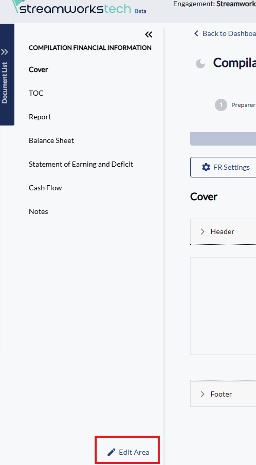- You can add and remove pages of the Financial Information by clicking 'Edit Area' at the bottom of the contents page.