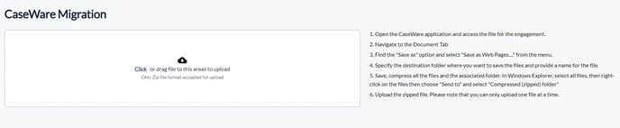 A box will be presented where you can drag and drop your CaseWare ZIP file for import.