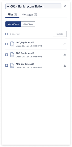 - When you click on an Internal Files column of a specific row, it opens a pop-up will Internal Files and Client files. In the first tab, you will be able to view all files, upload new files, download existing files and delete all/specific files.