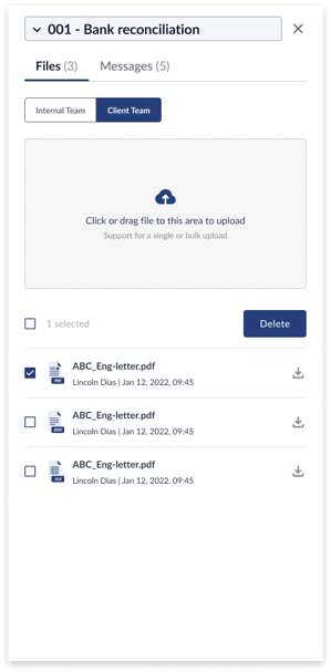 - When you click on a Client Files column of a specific row, it opens a pop-up will Internal Files and Client files. in the second tab, you will be able to view all client files, upload new files, download existing files and delete all/specific files.