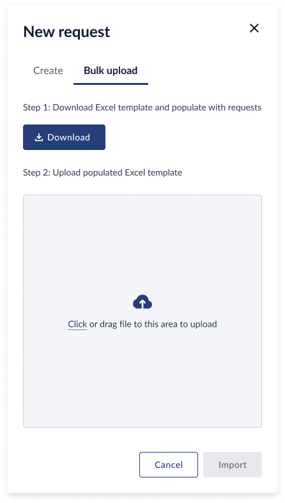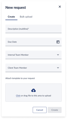 - Bulk upload: user has the ability to download a template, add multiple rows and fill in the following fields including, Description, Due date, Internal team member, Client team member and upload back into the system. This option gives the ability to add multiple requests in one go. For each request, you will be able to attach files to the platform. There will be Cancel button to discard change and Import button to upload the changes.