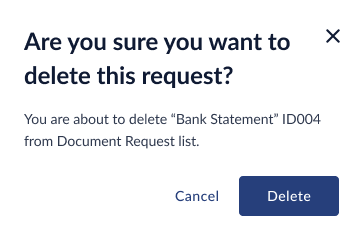 - There will be a delete icon on each row to delete the entire request. Before deletion, a warning pop-up will be displayed on-screen, "Are you sure you want to delete this request", The user can confirm by selecting "Delete" or alternatively select "Cancel". User has the option to multi-select rows and delete all requests.