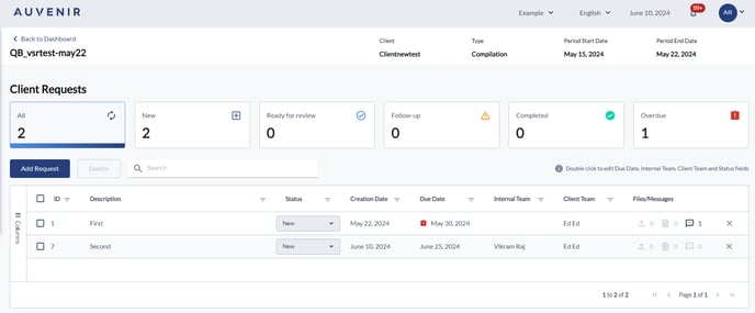 Client Requests Dashboard will allow the user to request all required documents including viewing all existing requests, adding a new request, editing/deleting Document Request details, viewing and responding to the messages in the Document Requests.