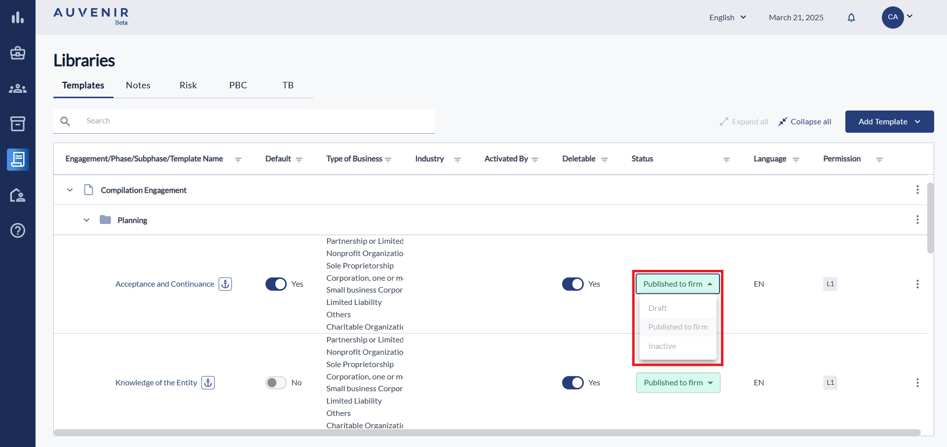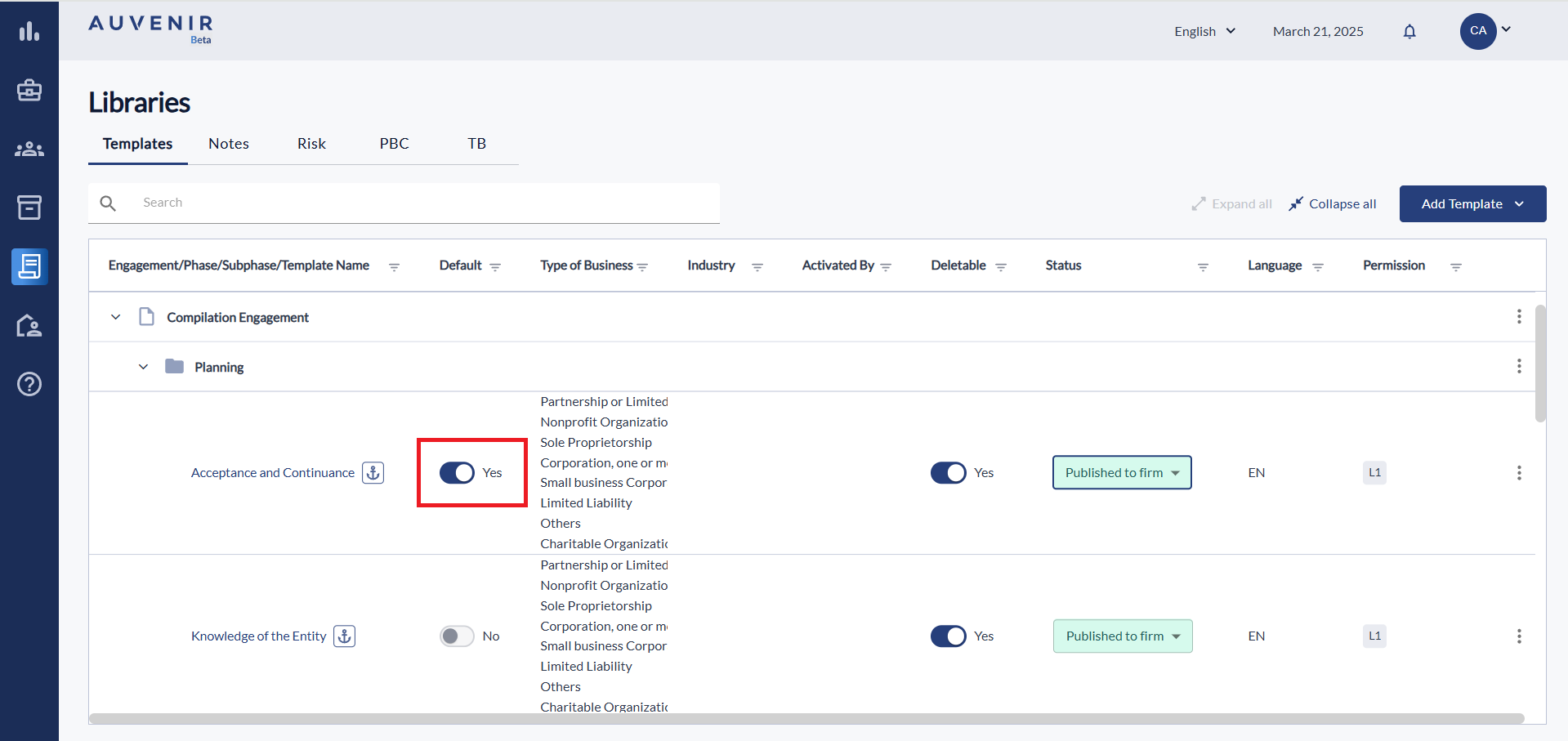 This will ensure that each time you create a new Engagement your preferred templates are already activated