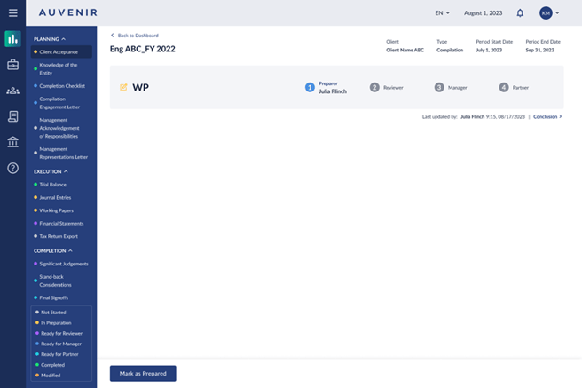 - For the preparer, the action button shows "Mark as Prepared".