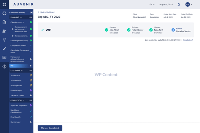 - Status functionality is available in the trial balance, financial report, work-papers, and selected templates.