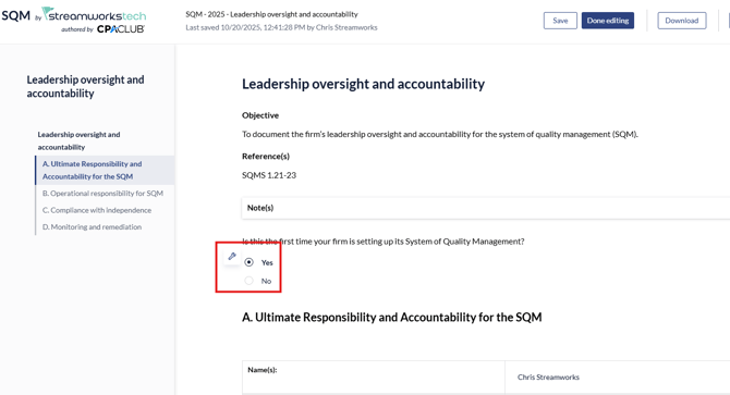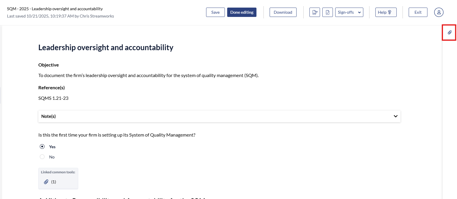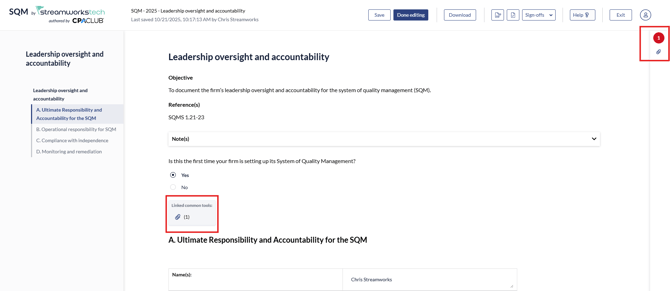- You will see two visual indicators, one showing which section the common tool is attached to in the form, and another to the right. The red symbol will disappear after saving the form.