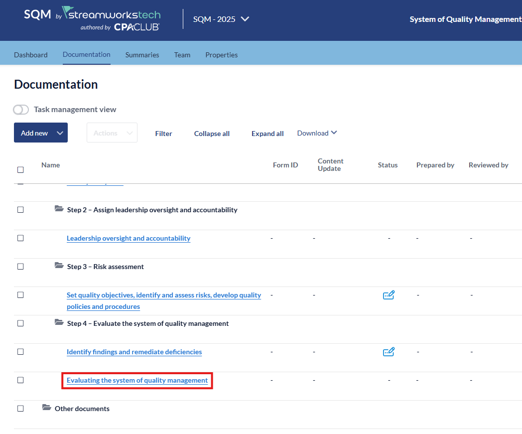 - Select the 'Evaluating the System of Quality Management' form from the Documents page.