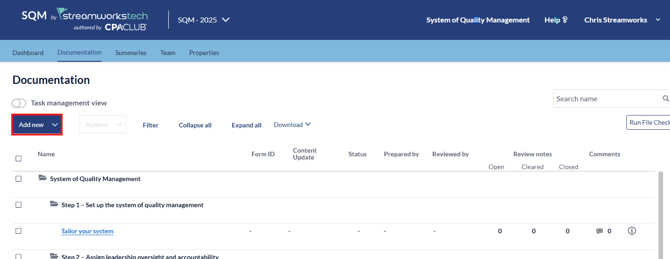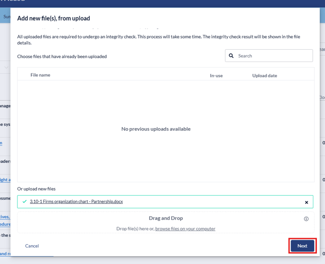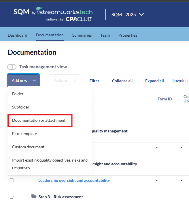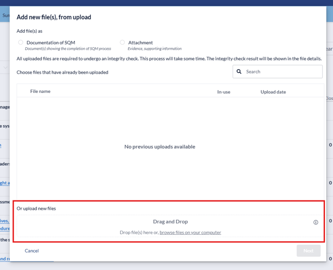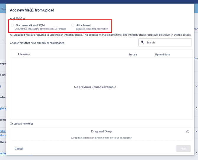 - From the pop up, select whether you want to upload a form as a Documentation or Attachment.