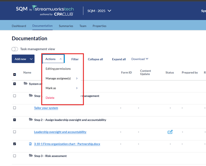 - Click the 'Actions' drop down menu and select 'Delete'.