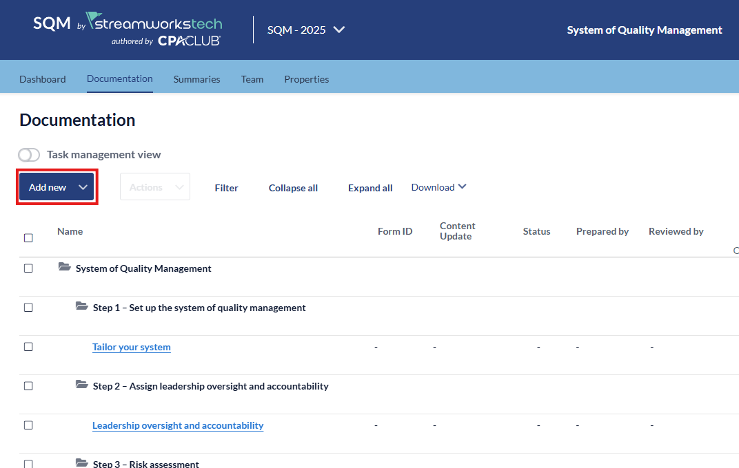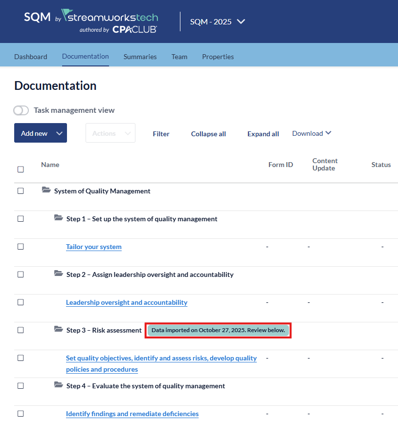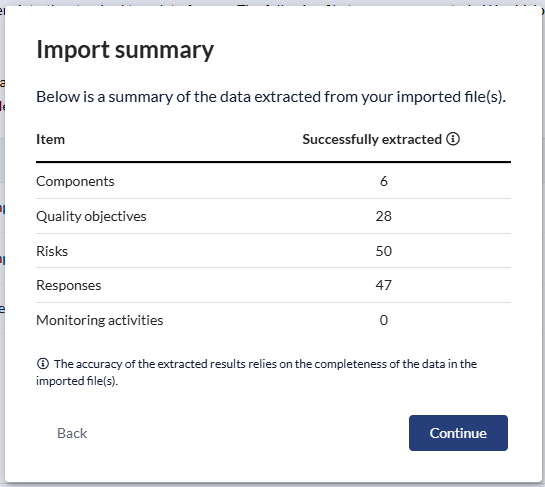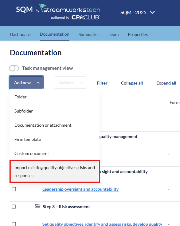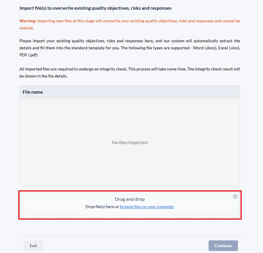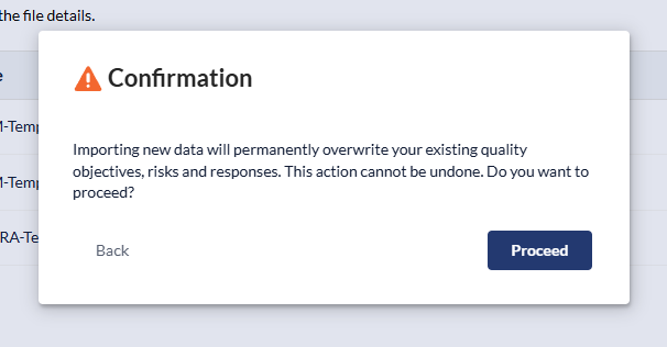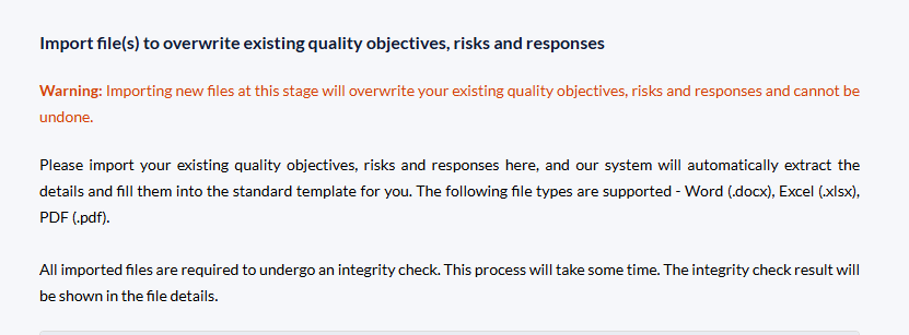 - Select 'Import existing quality objectives, risks and responses' from the dropdown menu.