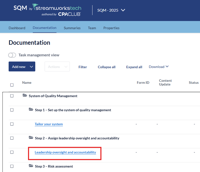 - Select the 'Leadership Oversight and Accountability' form from the documents page.
