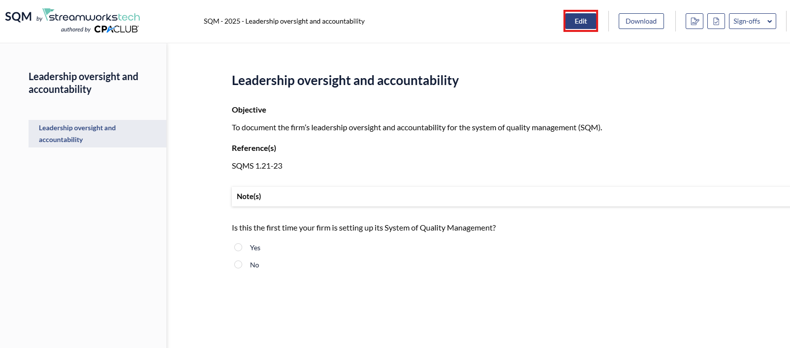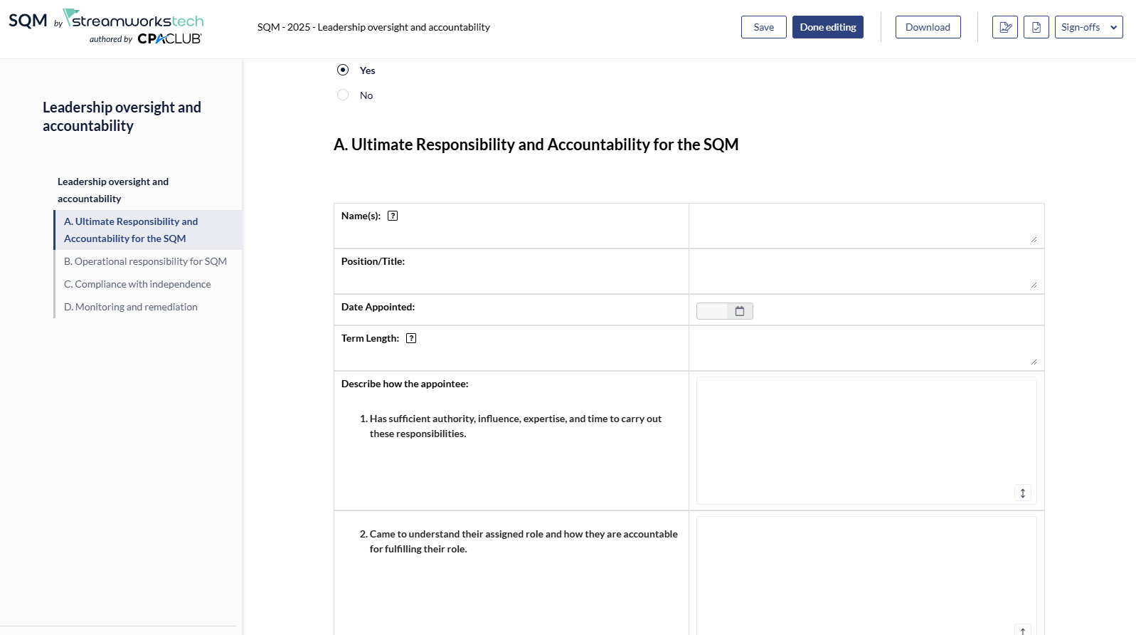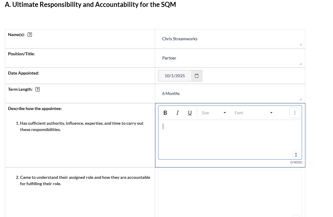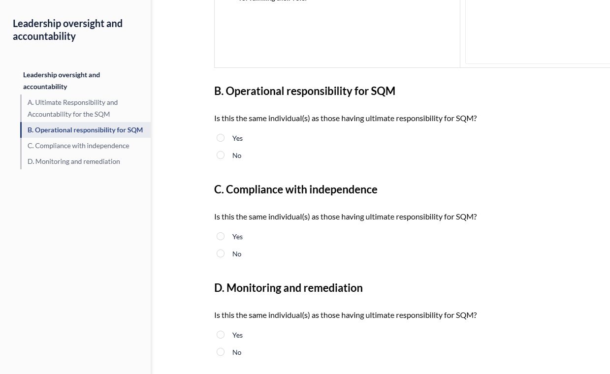- Select whether the this is the first time setting up an SQM or not, this will unlock the fill in forms below to specify the roles of firm members.