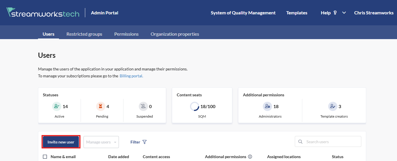 - From the 'Users' section of the Admin Portal, click 'Invite New User'.