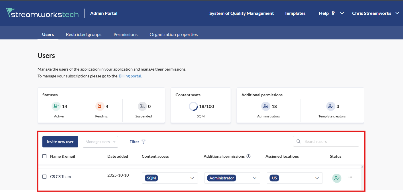 - After adding a user and they have accepted they will appear in the table in the Admin Portal.