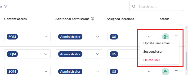 - You can update an email or deactivate a user by using the 3 dot menu on the far right.