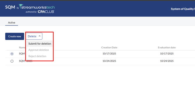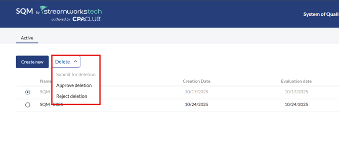 - Select the greyed out SQM and click the 'Delete' dropdown again and select 'Approve Deletion'.