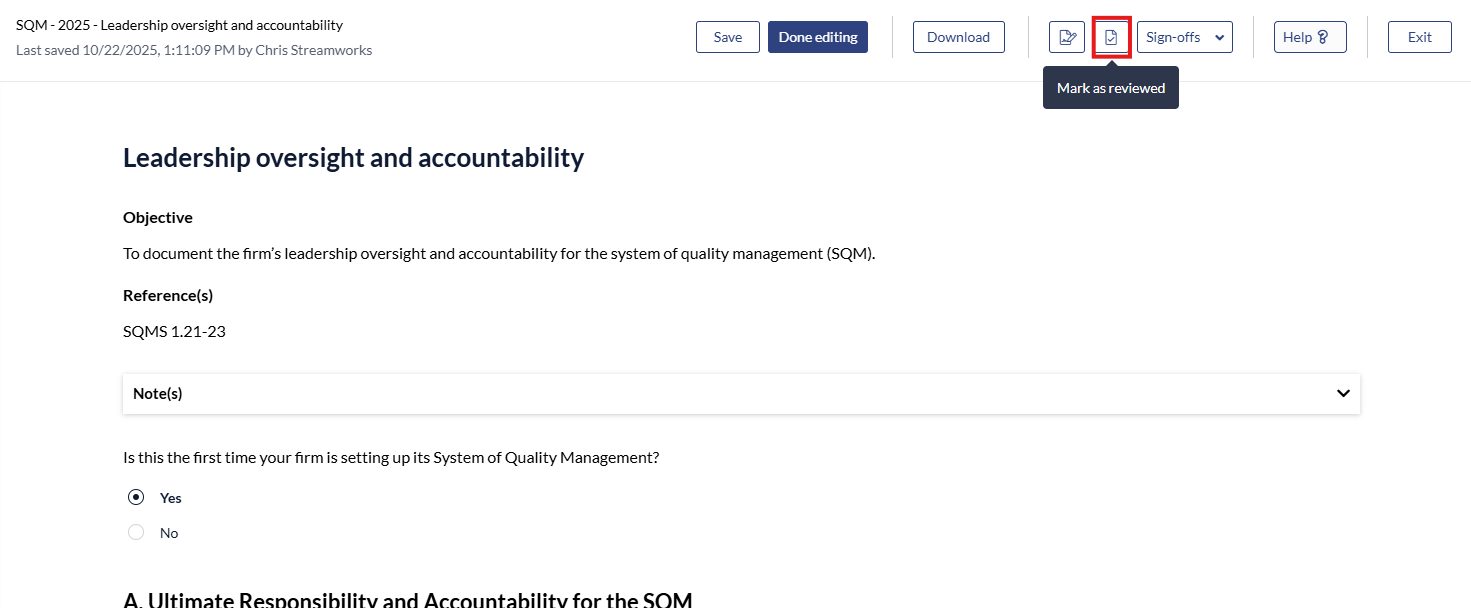 - When the document has been reviewed and ready to be signed off, the reviewer can click this button.
