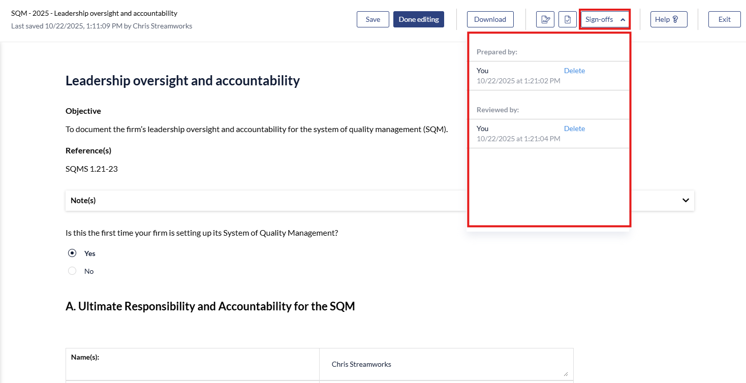 - All Sign-Offs on the document can be reviewed with the 'Sign-Off' dropdown.