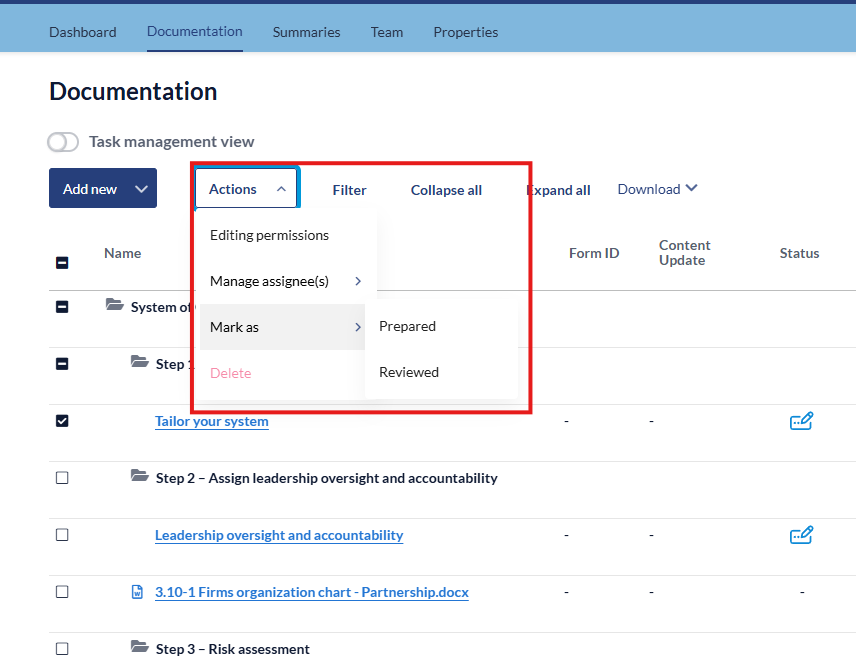 - Click the 'Actions' dropdown menu, select 'Mark As' and select whether the document has been reviewed or prepared.