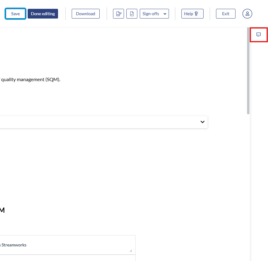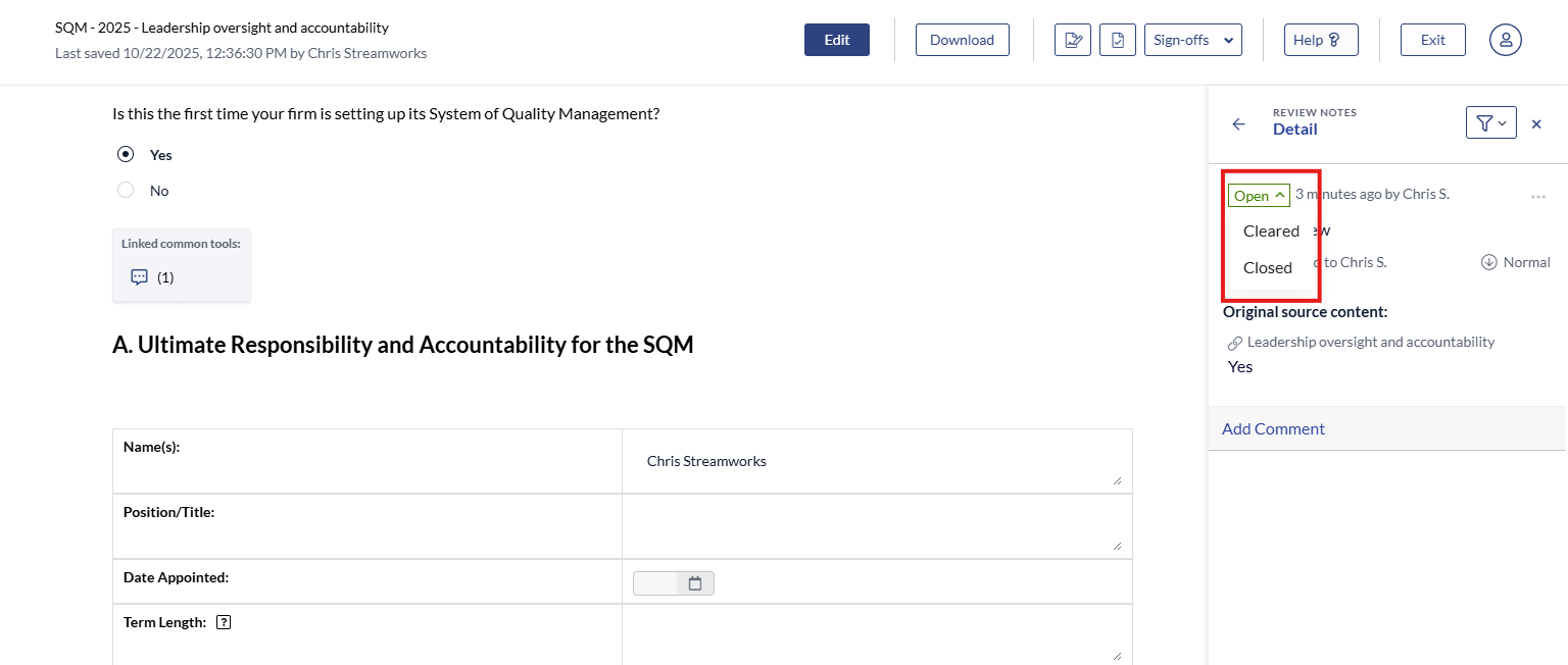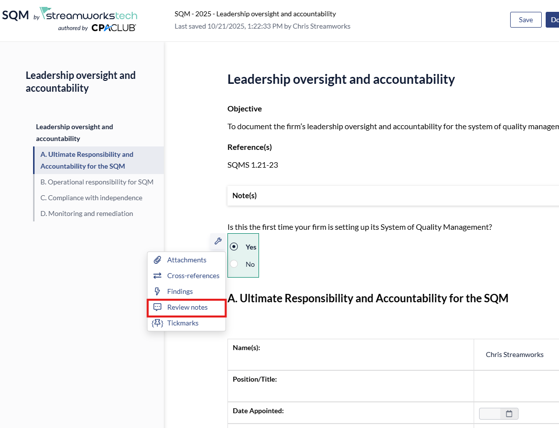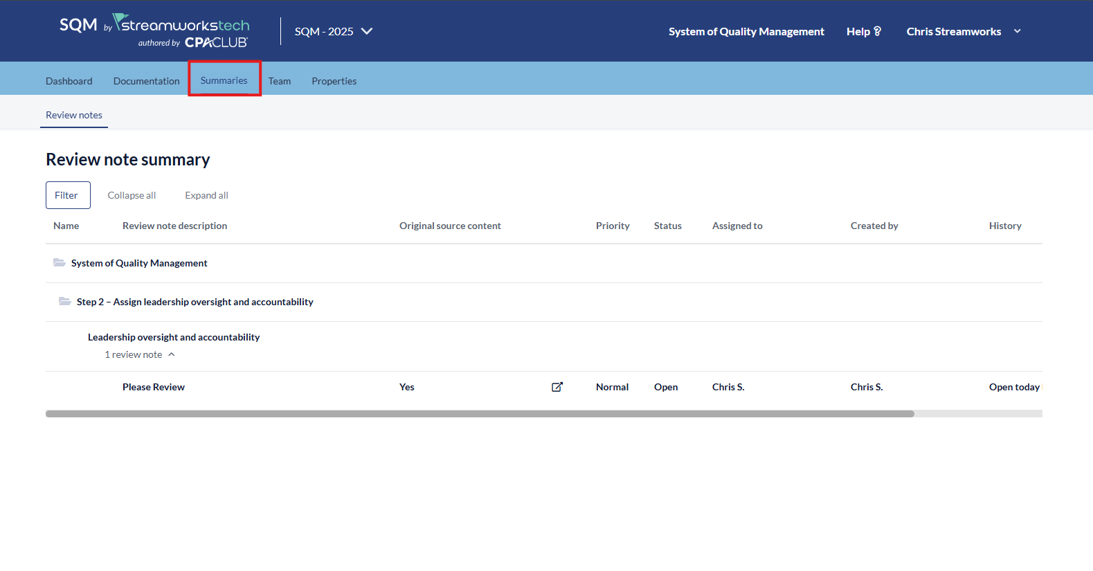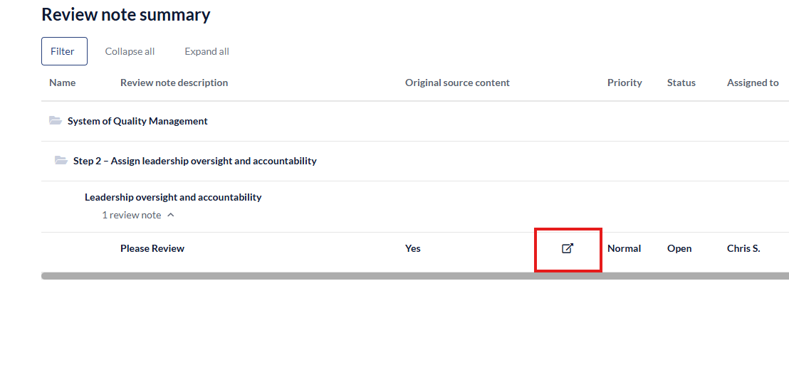 - You can click the box and arrow icon to be taken to where the Review Note is embedded in the SQM.