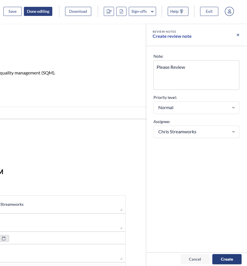 - From the right panel, leave a note, set a priority level and assign a team member to the review note.