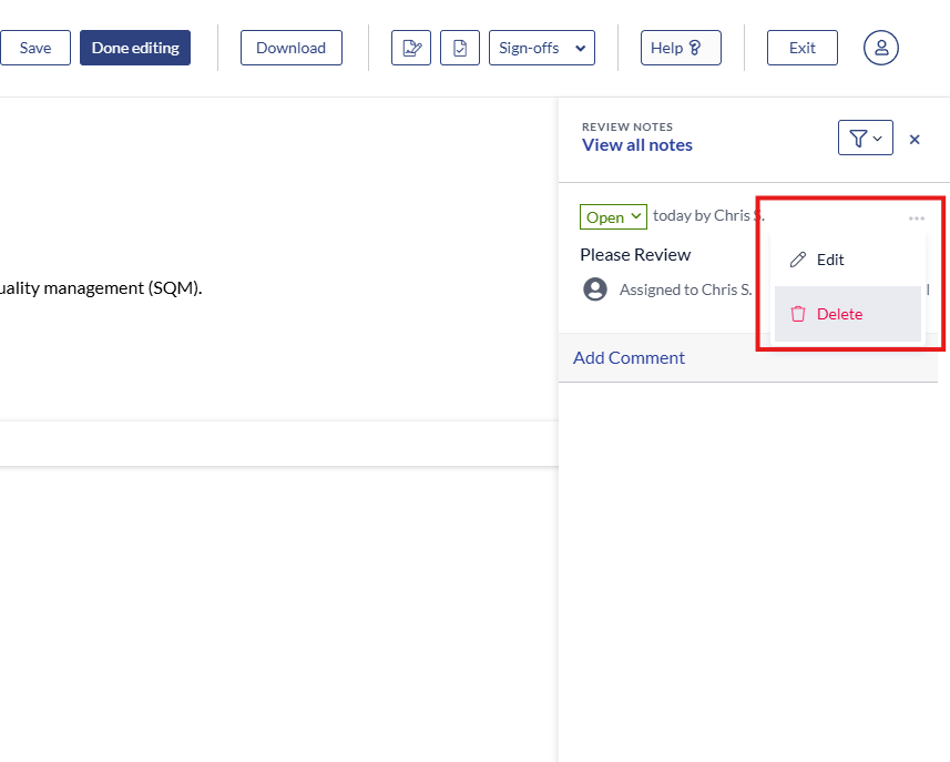 - Click the 3 dot menu and select 'Delete' to remove the Review Note.