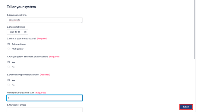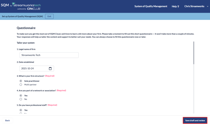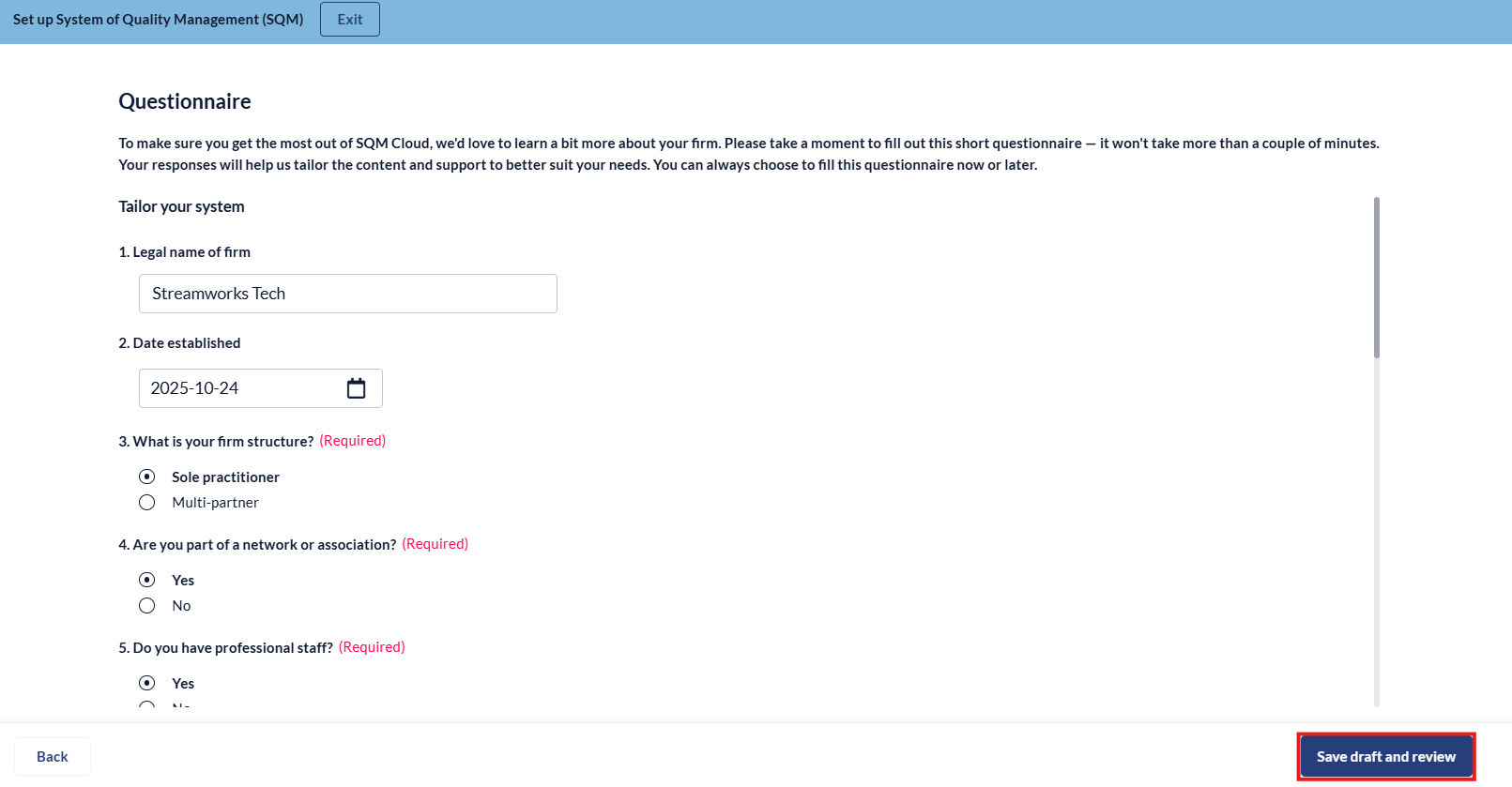 2. Fill in the questionaire and click 'Save draft and review'.