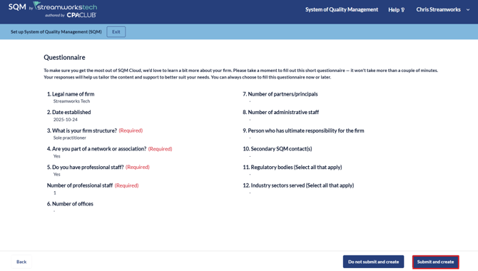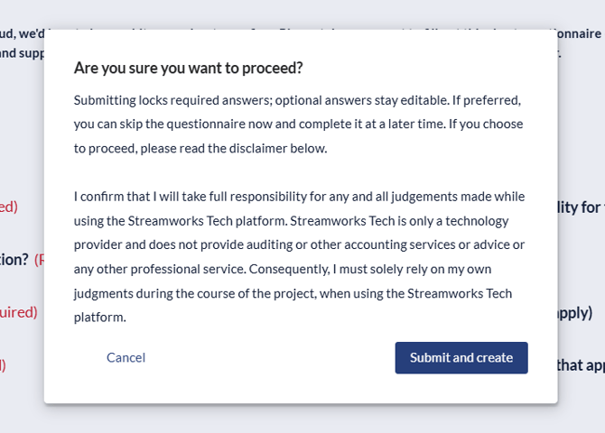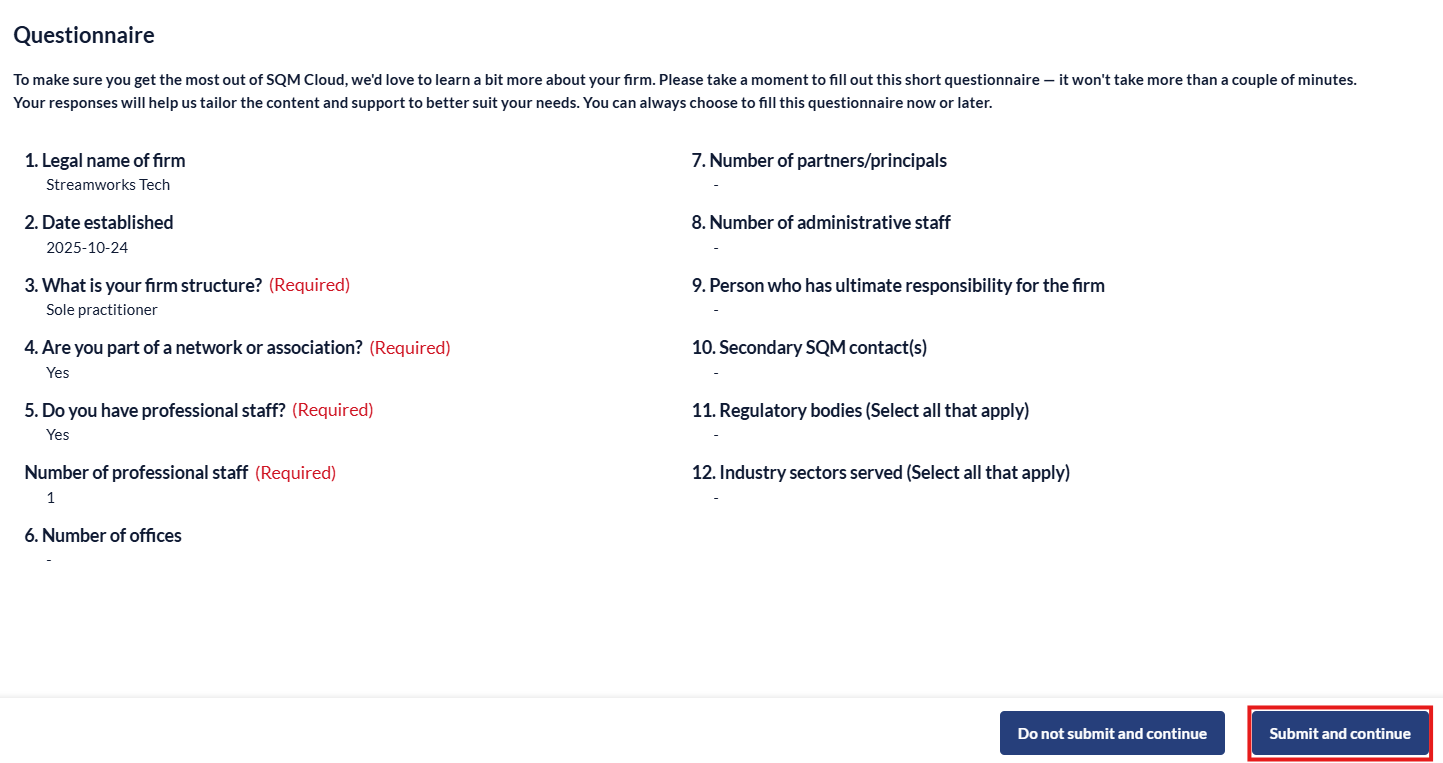 3. Review the questionnaire and click 'Submit and continue'.