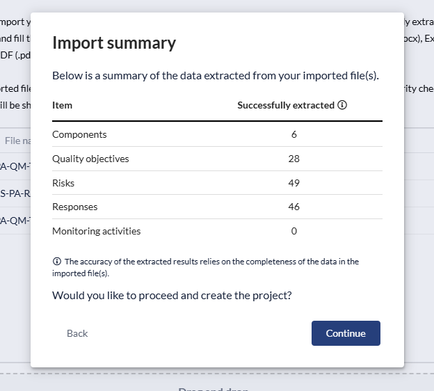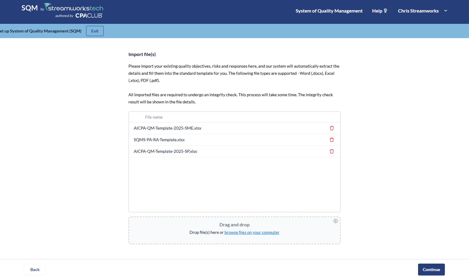 4. You will then be prompted to upload your current SQM excel sheets, when uploaded, click 'Continue' to create the SQM.